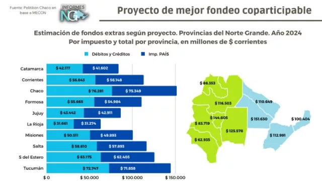 Por ende, totalizando ambos tributos proyectados, el total extra que captarán las provincias de la región sería de: $ 83.179 millones para Catamarca; $ 112.991 millones para Corrientes; $ 151.630 millones para Chaco; $ 110.649 millones para Formosa; $ 86.353 millones para Jujuy; $ 62.935 millones para La Rioja; $ 100.404 millones para Misiones; $ 116.503 millones para Salta; $ 125.578 millones para Santiago del Estero; y $ 144.605 millones para Tucumán.