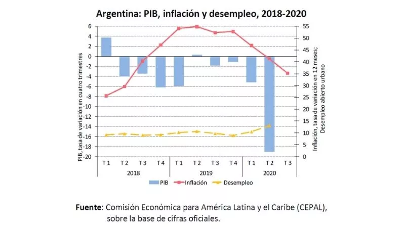 “En 2020 la economía de la Argentina cayó por tercer año consecutivo. Este desempeño se debió al impacto de la crisis de la pandemia de la enfermedad por coronavirus (COVID-19), que repercutió negativamente en el consumo privado, la inversión y las exportaciones. Se prevé que al cierre el año el PIB haya caído un 10,5%, cifra mayor a la contracción registrada en 2019 (2,1%). En este marco, y a partir de una menor depreciación del tipo de cambio oficial y del congelamiento de un conjunto de precios regulados, la inflación se desaceleró al 43,5% interanual en el acumulado a octubre respecto al 53,5% promedio del año anterior”, inicia el capítulo de nuestro país.