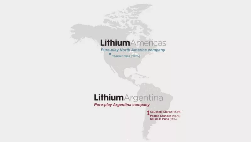 Lithium Américas está avanzando en la separación de sus unidades comerciales de EE. UU. y Argentina en dos empresas públicas independientes. Lithium Argentina retendrá el proyecto Cauchari-Olaroz (con participación del 44,8 %), en Jujuy, enfocada en avanzar hacia la plena capacidad de producción; y en oportunidades de crecimiento regional en la cuenca de Pastos Grandes con los proyectos Pastos Grandes y Sal de la Puna (participación del 100 % y participación del 65 %, respectivamente). Por su parte, Lithium Americas (NewCo) conservará Thacker Pass, de propiedad del 100 %, centrado en avanzar en la construcción y producción en la segunda mitad de 2026. Actualmente, la empresa cotiza tanto en TSX como en NYSE con el símbolo de cotización "LAC".
