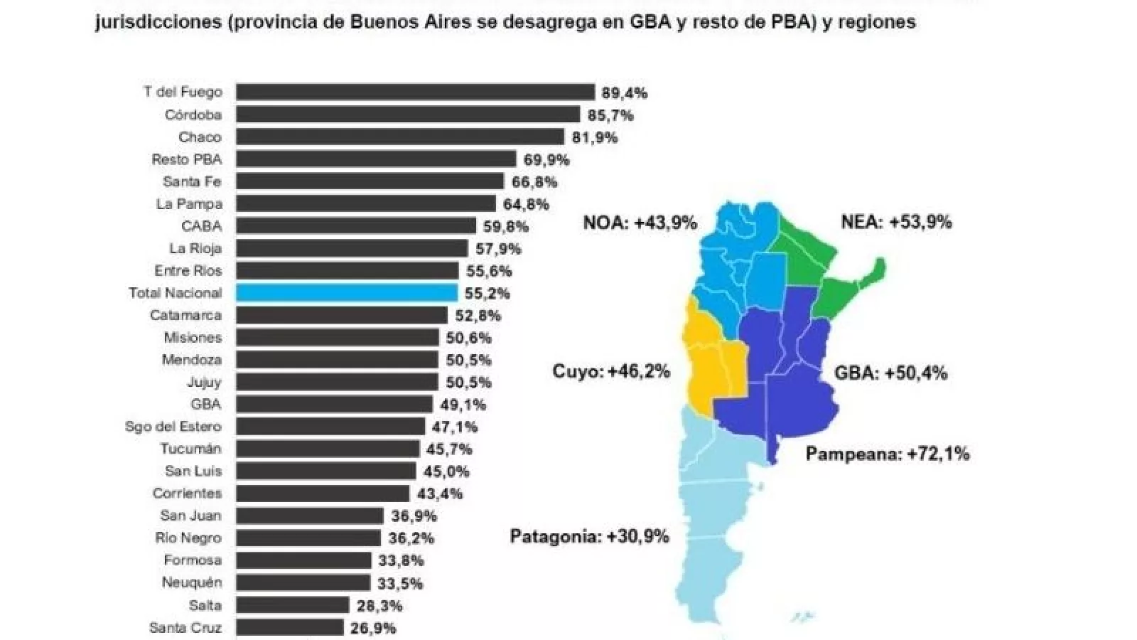 Entre las seis provincias restantes, se encuentran las otras cuatro que pertenecen al NOA: Salta (+8,5%), Tucumán (+4,8%), Santiago del Estero (+4,2%) y Catamarca (+0,2%). De esta forma el NOA es la única región del país donde todas las jurisdicciones que la integran mostraron alzas.