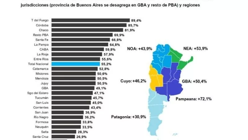 El primer cuatrimestre acumulado del año cierra con resultados positivos para todas las jurisdicciones. El total nacional muestra una variación del primer cuatrimestre del 2021 contra mismo período del 2020 del 55,2%, y nueve jurisdicciones tuvieron incrementos por encima de la media nacional: Tierra del Fuego (+89,4%), Córdoba (+85,7%) y Chaco (+81,9%), y los restantes seis distritos que muestran alzas superiores a la media nacional son provincia de Buenos Aires (excluyendo GBA), Santa Fe, La Pampa, CABA, La Rioja y Entre Ríos.
