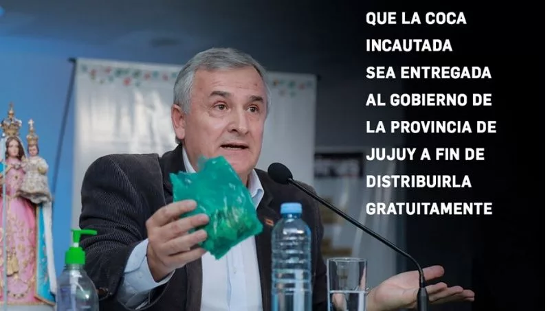 Morales informó que al pedido lo realizó mediante una presentación por escrito “pidiendo que toda la coca incautada por la Justicia Federal en el marco de contrabando tipificado como delito, le sea entregada al Gobierno de la Provincia de Jujuy a fin de que, en el marco de un protocolo que también les he presentado, sea distribuida gratuitamente a las comunidades indígenas y a los trabajadores del campo y de la construcción, dejando abierta la posibilidad para ser entregada a otros sectores”.