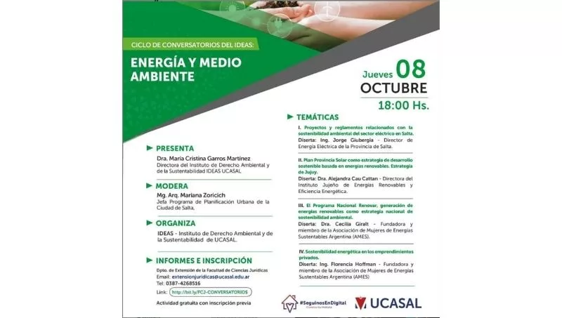 La convocatoria del IDEAS es abierta a la comunidad en general, y se da en el marco de su Ciclo de Conversatorios, que el jueves 8 presentará el titulado Energía y Medio Ambiente, y el viernes 9 el que refiere a Regulación y Gestión de Residuos.