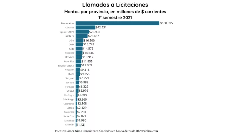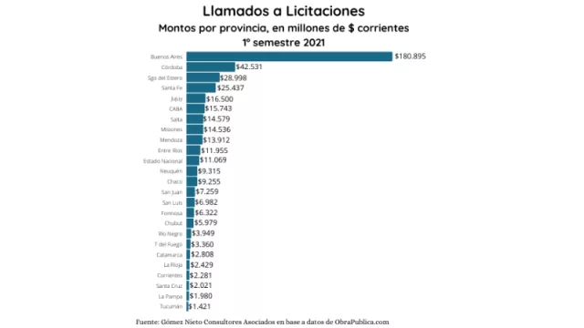 La provincia de Buenos Aires lidera el ranking nacional acumulado al primer semestre, con licitaciones por un total de $180.895 millones, y le sigue Córdoba con $42.531. Por ende, se observa una notable brecha ya en los primeros dos lugares, que se amplía mucho más, por supuesto, al compararlos con las provincias del fondo de la tabla.
