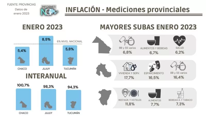 Así como el 2022 terminó con niveles de inflación récord en las provincias de la macrorregión que miden sus IPC locales, el inicio del 2023 consolidó la tendencia de la fuerte suba de precios en el Norte Grande y tuvo como protagonista a Jujuy, provincia que mostró una suba del 8,5% en enero, siendo la más alta para un mes desde el pasado marzo (donde el registro fue de 9,6%) y acelerando además 2,4 puntos porcentuales respecto a diciembre.