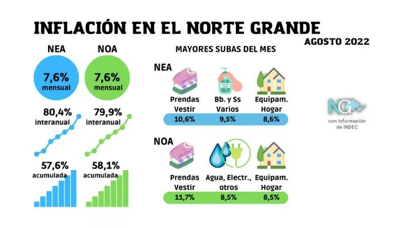 A su vez, en la comparación interanual (vs. agosto 2021) otra vez el Norte Grande protagoniza un extremo del ranking: con marcas del 80,4% (NEA) y 79,9% (NOA), estas regiones son las de mayor crecimiento de la inflación en el país.
