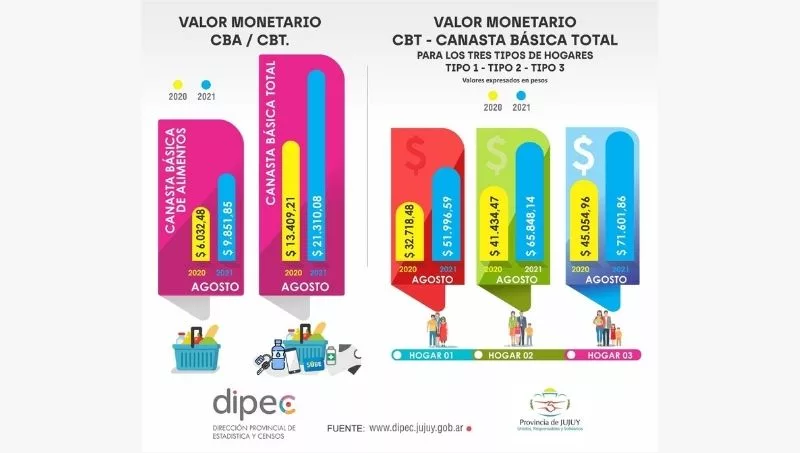 En agosto de 2020, la CBA era en Jujuy de $45.094,96, mientras que en agosto de este año se midió un valor de $71.601,86, esto para un hogar biparental y con dos hijos/as.