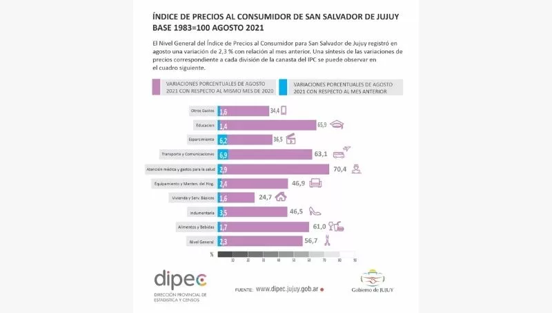 El Nivel General del IPC para San Salvador de Jujuy registró en agosto una variación de 2,3 % con relación al mes anterior. Respecto a agosto de 2020, la variación fue del 56,7%, mientras que respecto a diciembre del último año, fue de 32%. La mayor variación por rubros la tuvo Transporte y comunicaciones, con un 6,9% respecto al mes anterior, un 63,1% respecto a agosto de 2020 y un 49,3% respecto a diciembre pasado. Le sigue el rubro Esparcimiento, con un 6,2%, un 36,5% y un 10,2% en iguales referencias que las anteriores.
