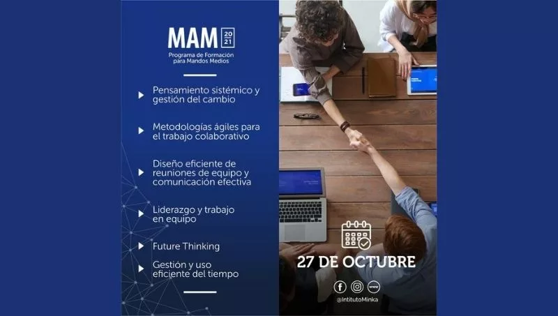 Ahora, tiene abierta la convocatoria a una propuesta que lo distingue: la formación de manos medios. El Instituto Minka presenta a ese Programa de Formación como “la oportunidad educativa pensada para formarte como un gran líder de equipos eficientes”, e informa que la edición #MAM2021 iniciará casi terminando octubre y se abocará a desarrollar los ejes temáticos de pensamiento sistémico y gestión del cambio, metodologías ágiles para el trabajo colaborativo, diseño eficiente de reuniones de equipo y comunicación efectiva, liderazgo y trabajo en equipo, Future Thinking y gestión y uso eficiente del tiempo.