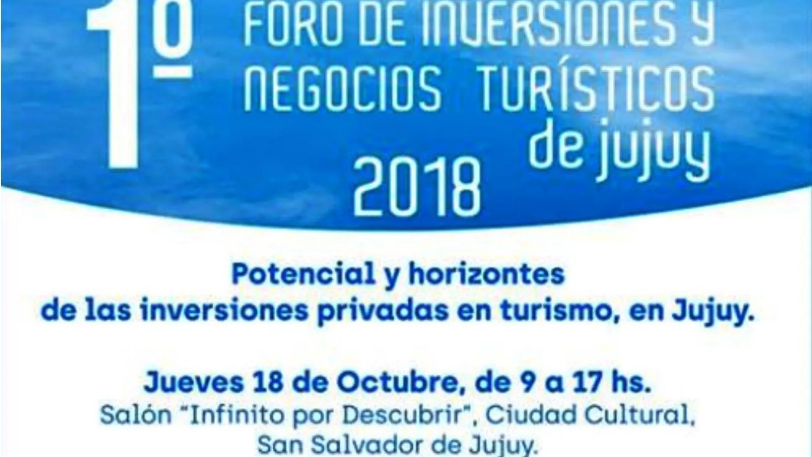 El Primer Foro de Inversiones y Negocios en Jujuy tendrá lugar en el Salón Infinito por Descubrir de Ciudad Cultural durante la mañana y media tarde del jueves 18 de octubre.
