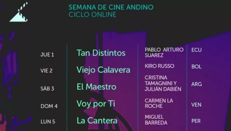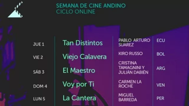 Las películas que estarán disponibles serán: “Tan distintos” de Pablo Arturo Suárez (Ecuador), “Viejo calavera” de Kiro Russo (Bolivia), “El maestro” de Cristina Tamagnini y Julián Dabién (Argentina), “Voy por ti” de Carmen La Roche (Venezuela), “La cantera” de Miguel Barreda (Perú). Todos los documentales estarán disponibles por 24 hs., cada día se habilitará uno a partir de las 00 hs. de cada país. Cabe destacar que este ciclo se lleva a cabo gracias a la colaboración de los directores y directoras de las películas que aportan sus producciones para que puedan ser exhibidas de manera gratuita.