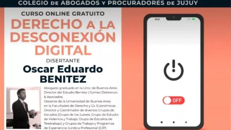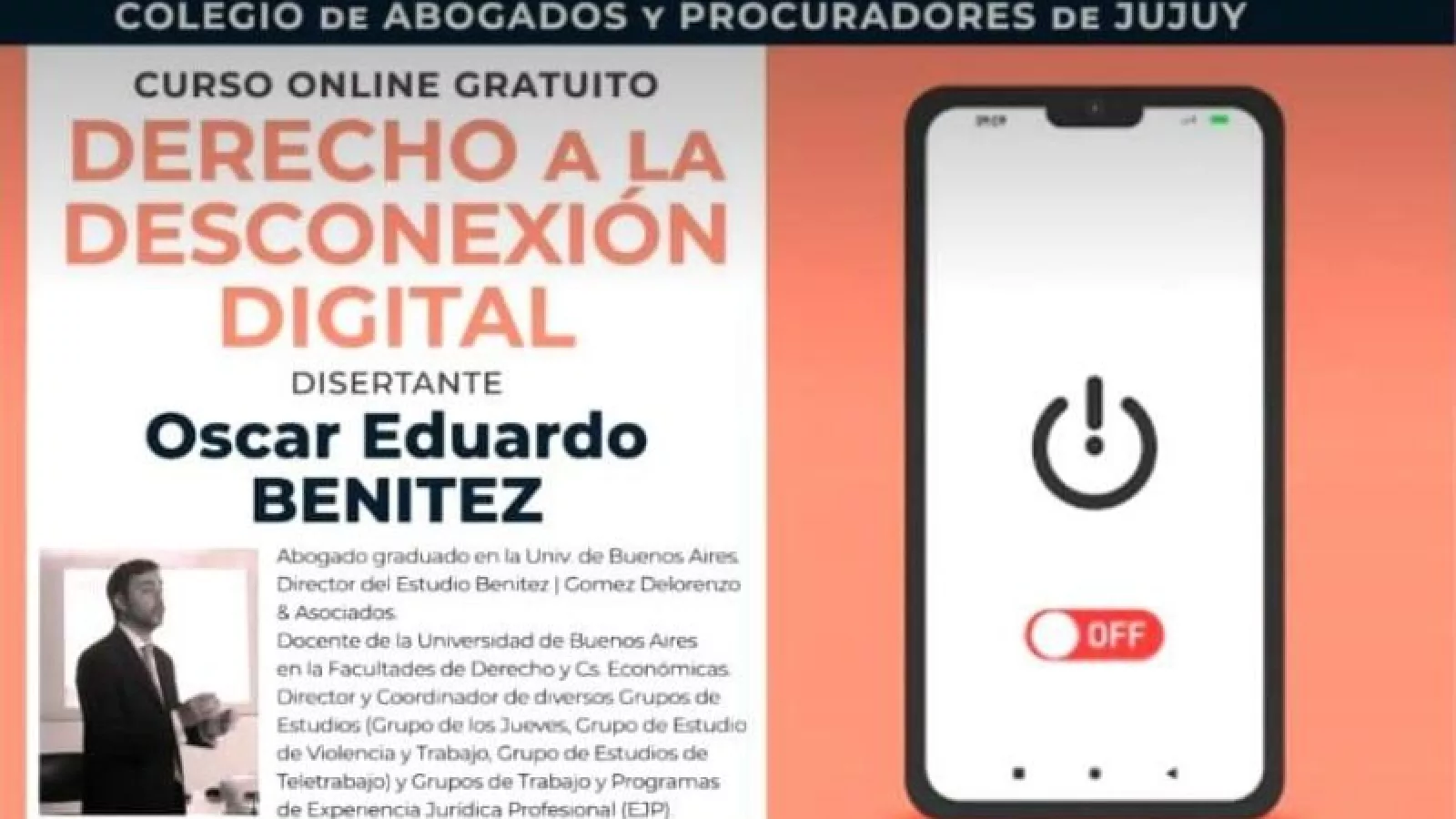 El jueves 10 a las 19.00 hs será la ocasión para cursar mediante la plataforma Zoom el curso on line gratuito sobre Derecho a la desconexión digital, que tendrá como disertante a Oscar Eduardo Benitez, abogado graduado en la Universidad de Buenos Aires (UBA), de la que es docente en la Facultad de Derecho y de Ciencias Económicas.