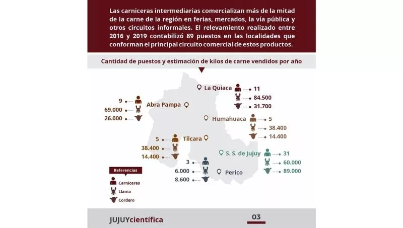“Las carnicerías intermediarias comercializan más de la mitad de la carne de la región en ferias, mercados, la vía pública y otros circuitos informales. El relevamiento realizado entre 2016 y 2019 contabilizó 89 puestos en las localidades que conforman el principal circuito comercial de estos productos. En su mayoría comandan emprendimientos familiares que abastecen a numerosos puntos de la provincia durante todo el año”.