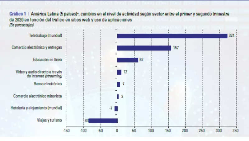 “Entre el primer y segundo trimestre de 2020, el uso de soluciones de teletrabajo aumentó un 324% y la educación en línea, más del 60%”, o que “en los países de la región, la concurrencia a locales de venta de alimentos y farmacias disminuyó un 51%, a establecimientos de comercio de productos no esenciales y esparcimiento, cerca de un 75%, y a lugares de trabajo, alrededor de un 45%”, son datos que deja fijados la CEPAL en este informe publicado hace menos de una semana, que a la vez que describe la tendencia de las relaciones productivas, también advierte que en 2019, dos tercios de los habitantes de la región (todo el Caribe y toda Latinoamérica) tenían conexión a Internet, mientras que todo un tercio restante de la población o no tenía o tenía un acceso limitado a las tecnologías digitales debido a su condición económica y social, en particular su edad y localización.