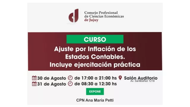 El curso es propiciado por el Consejo Profesional de Ciencias Económicas de Jujuy (CPCEJ) se desarrollará los días 30 y 31 de agosto, en el Salón Auditorio del Consejo, avenida Santibáñez 1218 de San Salvador de Jujuy. Los horarios son de 17 a 21hs el viernes, y el sábado, de 8.30 a 12.30.