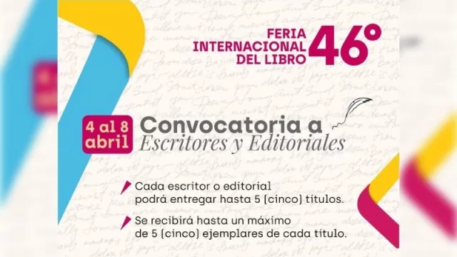 La Secretaría de Cultura a través de la Casa de las Letras, convoca a todos aquellos escritores, escritoras y editoriales de Jujuy que quieran dar a conocer sus libros y venderlos en la 46° edición de la Feria Internacional del Libro de Buenos Aires, a presentar sus obras del 4 al 8 de abril del corriente año. Los mismos serán expuestos y vendidos en el stand de la Provincia de Jujuy del 26 de abril al 16 de mayo, fecha en que se desarrollará la reconocida feria internacional en Buenos Aires.