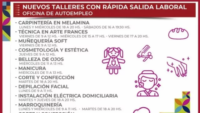 Los jueves de 9hs a 12hs, se ofrecen clases Cosmetología y Estética; en tanto los miércoles de 11hs a 13hs. Belleza de Ojos; o en el mismo horario el mismo día, curso de Manicura; los martes de 18hs a 20hs, se dictarán Corte y Confección. Los días lunes de 9hs a 11hs clases Depilación Facial; taller de Uñas los martes de 9hs a 12hs y Marroquinería los martes de 18hs a 20hs, o los lunes y miércoles de 9 a 11hs.