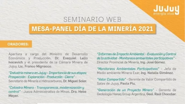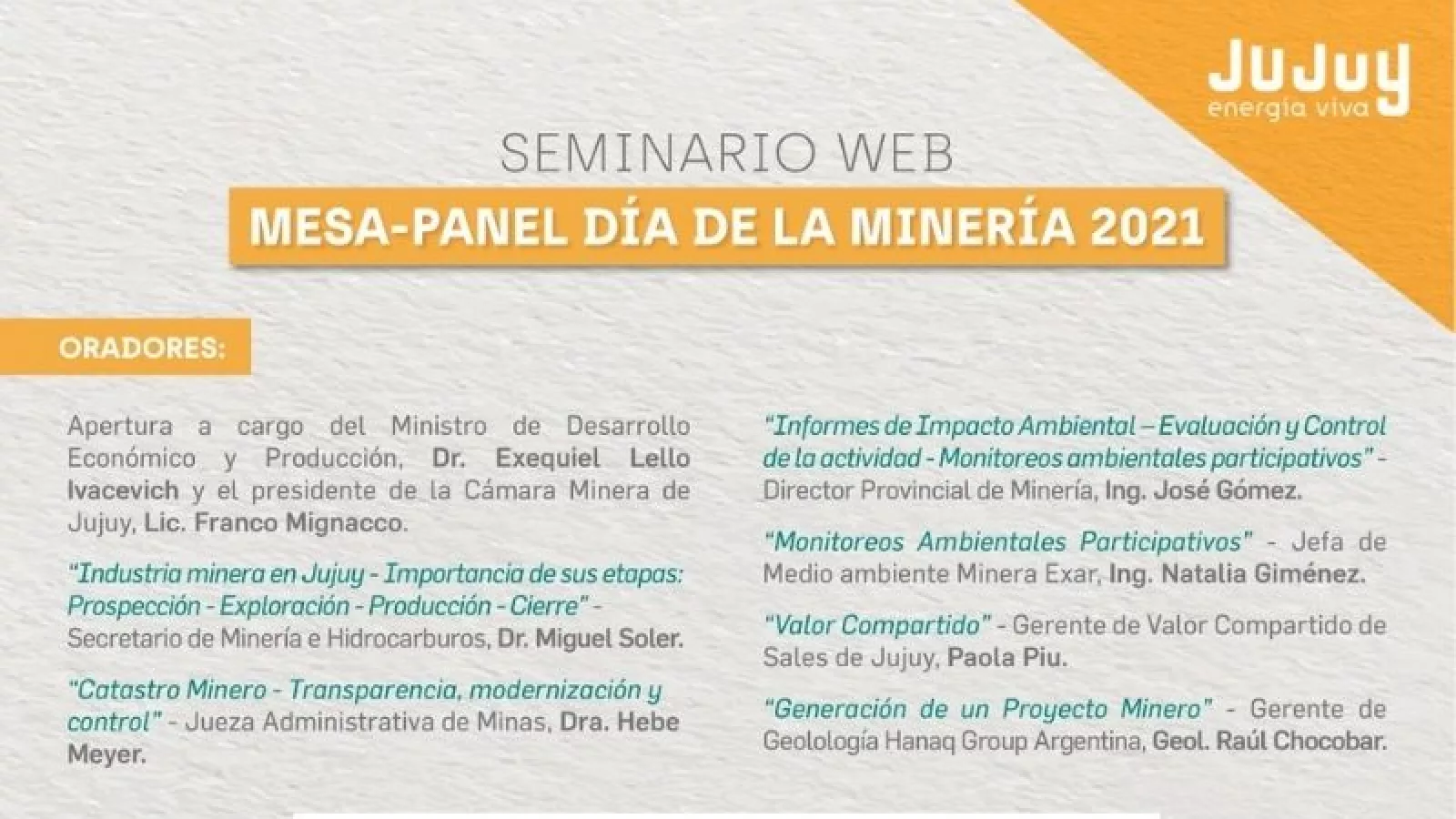 El evento virtual es organizado por el Gobierno de Jujuy y la Cámara Minera de Jujuy en el marco del Día de la Minería. Dicho seminario será gratuito y contará con la participación de especialistas y referentes del panorama minero local, quienes abordarán diversas temáticas.
