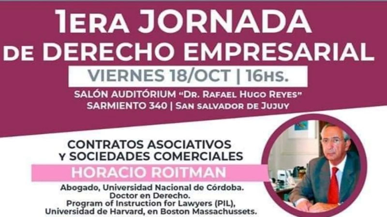 La jornada tendrá como principal disertante a Horacio Roitman, doctor en Derecho de la Universidad Nacional de Córdoba y de la Universidad de Harvard. Su exposición girará en torno a Contratos Asociativos y Sociedades Comerciales.