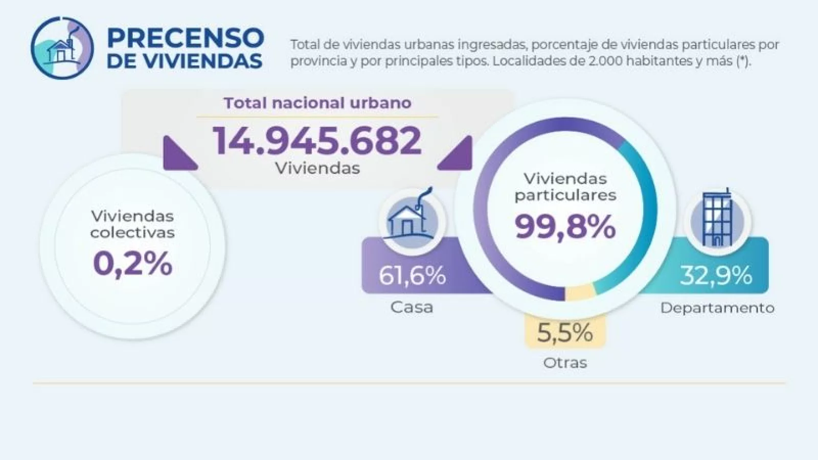 Mediante el Precenso de Viviendas realizado por el INDEC, plasmado en un mapa interactivo, se pudo conocer la distribución y el porcentaje de viviendas particulares por tipo en áreas urbanas de cada provincia argentina, departamento, partido o comuna. Esta nueva herramienta estará disponible para que cualquier ciudadano la consulte, y la misma se irá actualizando con nuevas capas de información. Un dato llamativo: la provincia de Santa Fe -con una población de aproximadamente 3,3 millones- tiene 243.334 viviendas más que la provincia de Córdoba, la cual tiene 3,5 millones de habitantes.