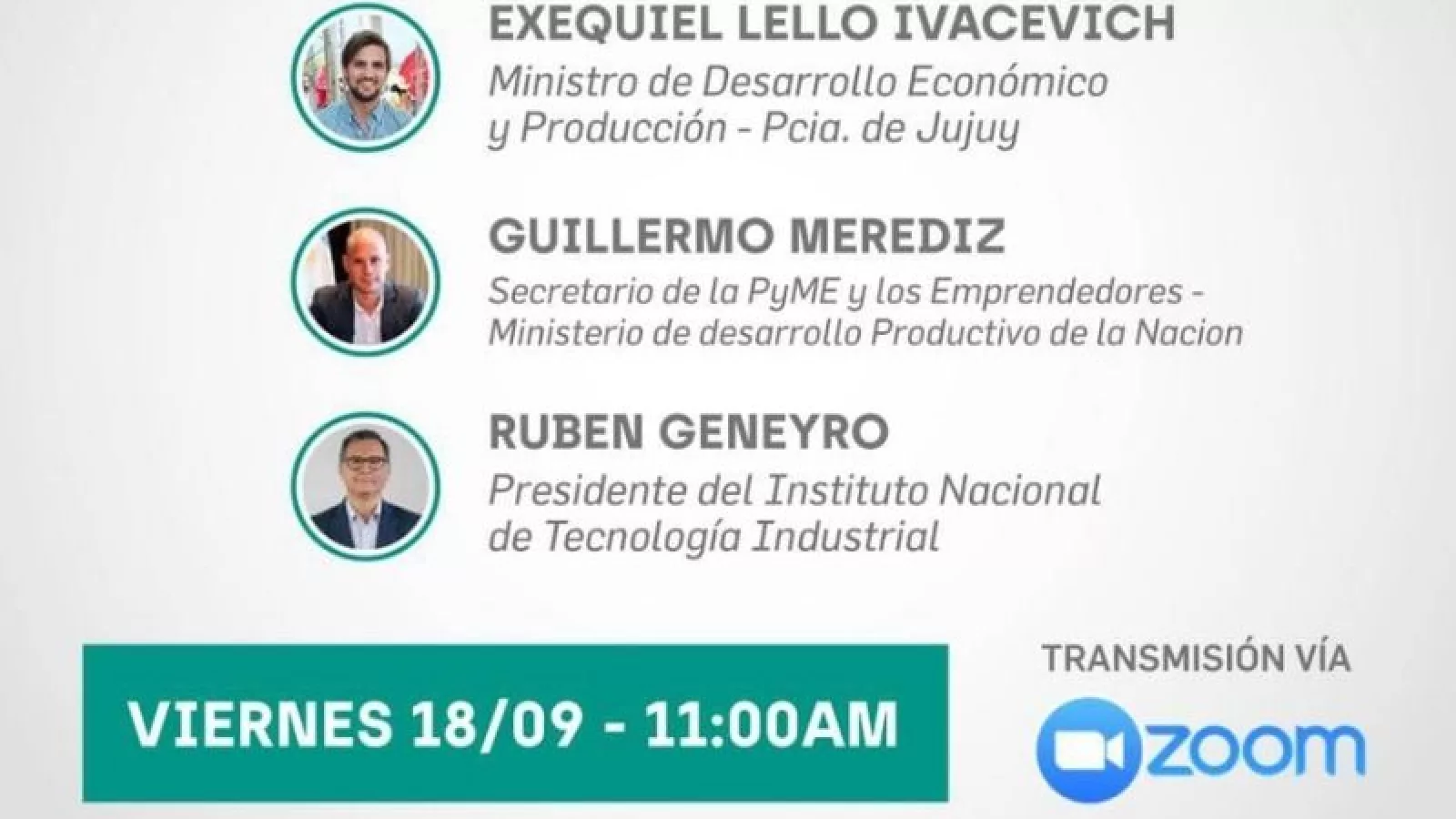 Como expositores, estarán el secretario de la pyme y los Emprendedores del Ministerio de Desarrollo Productivo de la Nación, Guillermo Merediz, el presidente del INTI, Rubén Geneyro, y el ministro de Desarrollo Económico y Producción de Jujuy, Exequiel Lello Ivacevich.