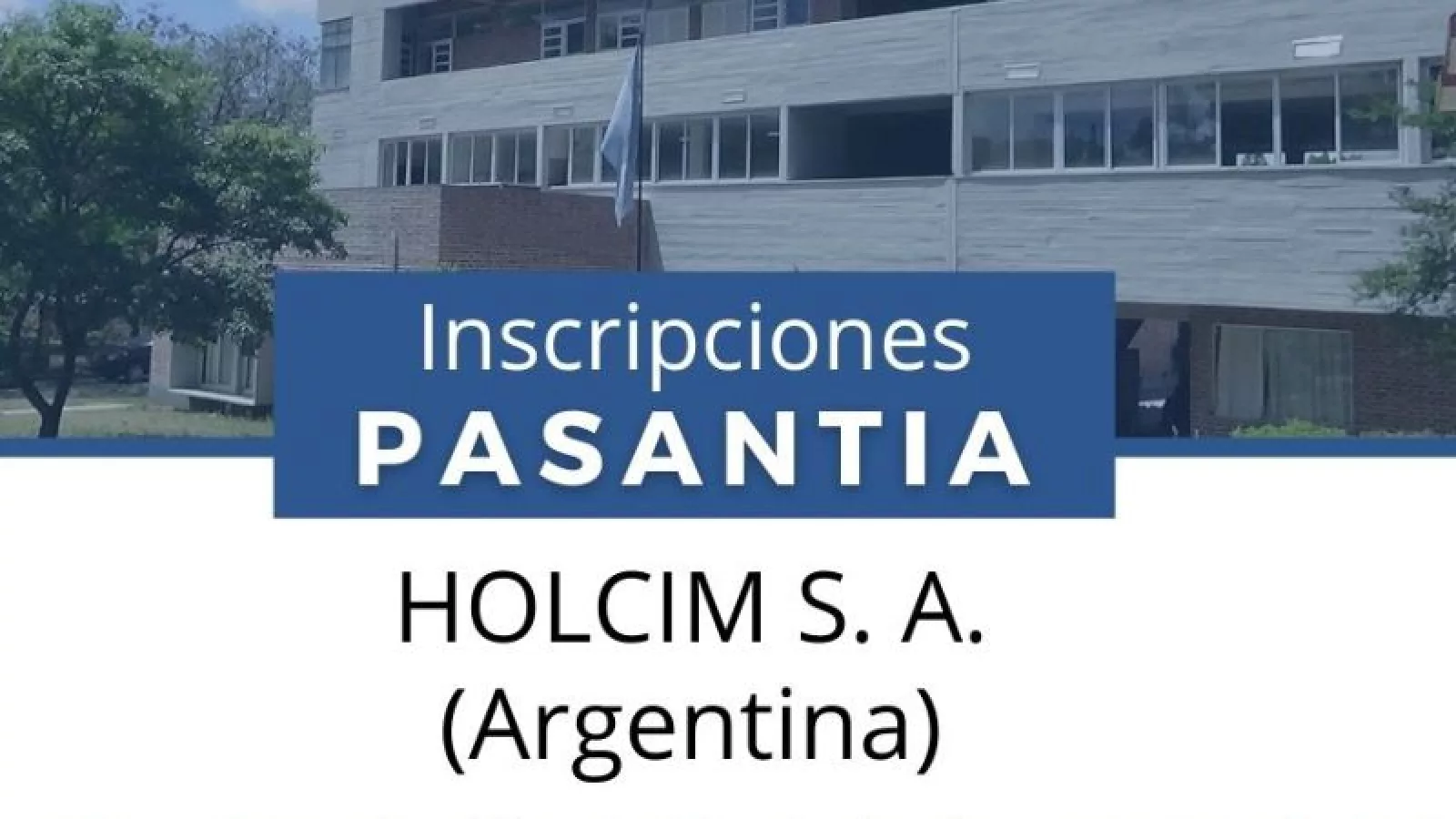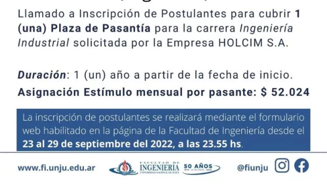 La Facultad de Ingeniería (FI) de la Universidad Nacional de Jujuy (UNJu), llama a la inscripción de interesados para cubrir 1 (una) Plaza de Pasantía para la carrera de Ingeniería Industrial, específicamente sector de Logística - Despacho, en la empresa Holcim S.A.