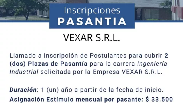 La convocatoria es organizada por la Facultad de Ingeniería (FI). En este sentido, desde la institución se llama a la inscripción de interesados para cubrir dos plazas de pasantías para la carrera de Ingeniería Industrial, a solicitud de la empresa mencionada.