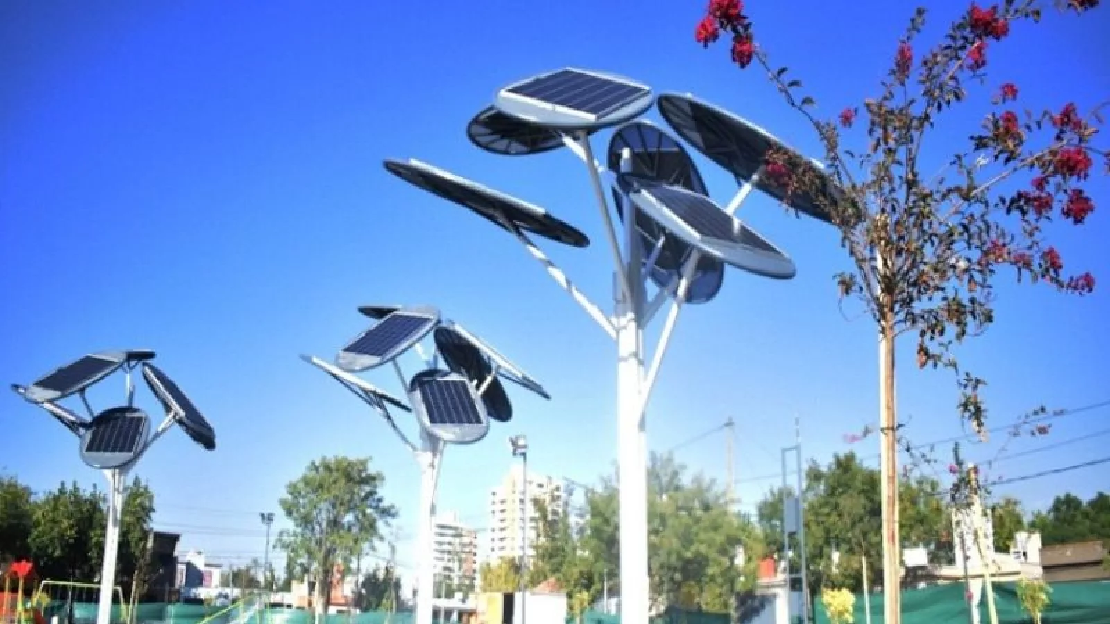 La primera plaza con árboles solares de Argentina está en Godoy Cruz, Mendoza. El intendente de la ciudad, Tadeo García Zalazar, explicó en Energía Limpia XXI que el espacio son 18 los paneles para proveer de energía al paseo y su entorno, además de que se coloca un medidor bidireccional para que esa producción se dirija a la red y genere un crédito a favor del municipio en la boleta de la luz.